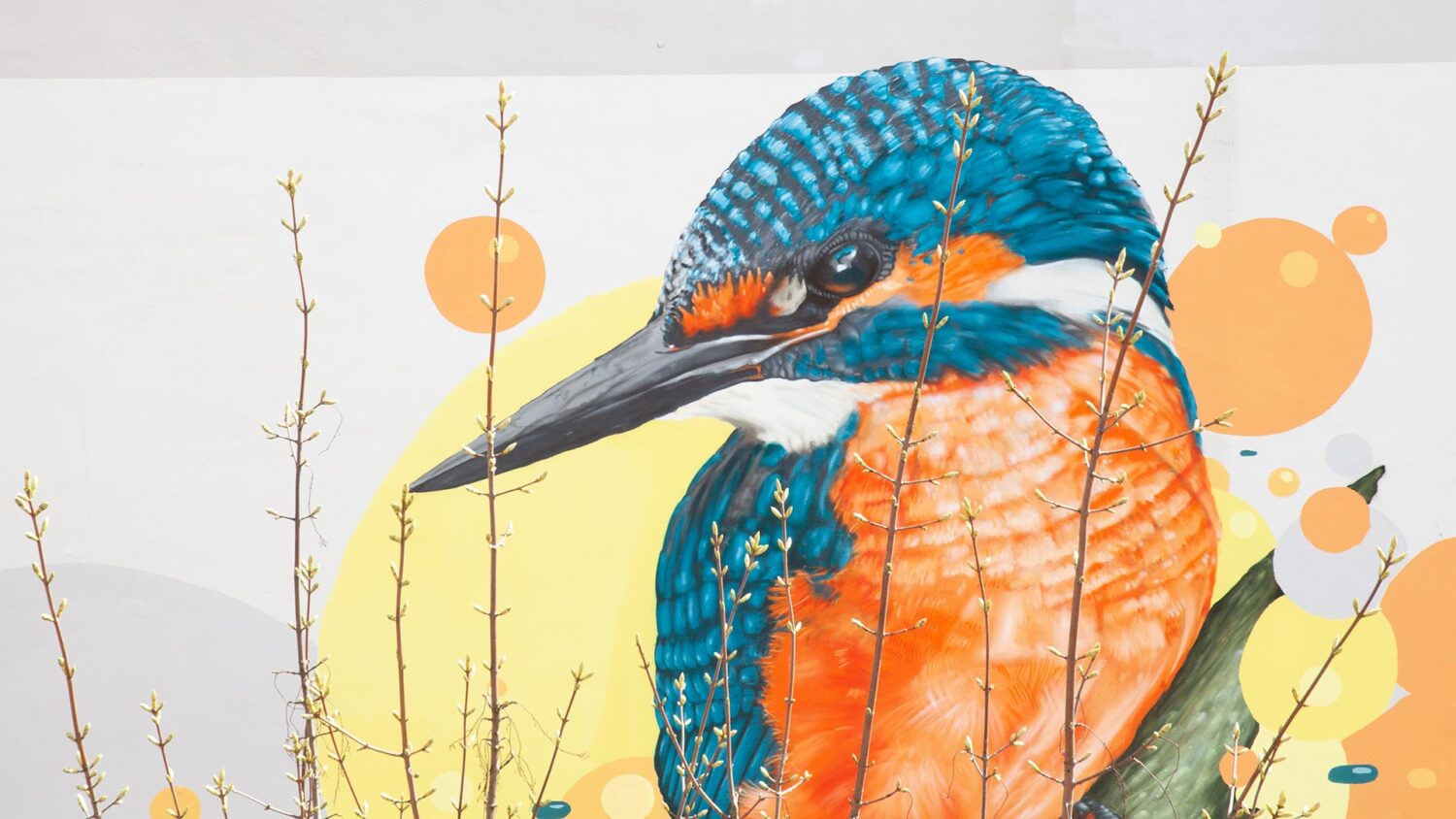 So ging es dann an die Suche, welcher Vogel wohl am geeignetsten wäre. Nach diversen klassischen heimischen Vögeln landeten wir bei der Entscheidung dann beim farbig herausstechenden Eisvogel. Wir hielten an den strahlenden Farben des Federkleides fest, um das Motiv positiv elegant zu Präsentieren. Als begleitende Elemente verwendeten wir bodenaufsteigende sich häufende Bubbles. Der Vogel orientiert sich an einer realistischen Darstellung und das Gesamtbild bedeckt etwa eine Grundfläche von 10x10m. Als die Zeit der Umsetzung des Street Art Auftrag kam, wurden wir vor Ort von den Mietern des Hauses aufgeklärt, dass in den frühen Neunziger Jahren bereits ein mexikanischer Künstler eine Friedenstaube an die Fassade gebracht hat. Das hat uns gefreut, dass wir unwissentlich ein altes Motiv, in neuem Federkleid, haben wieder aufleben lassen.