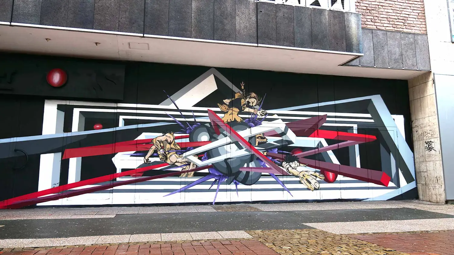 Street Art Hannover trifft auf Comic und Manga. Dieses Bild fügt sich mit gekippten Elementen ,welche sich nach vorne hin in ihrer Größe präsentieren und von einer Rauchwolke ,ähnlich wie bei einer Explosion, betont werden. Gegeben ist hier eine 3D-Situation, die durch Perspektive und Größenordnung fast Real erscheint. Da hier verschiedene Techniken aufeinandertreffen, gibt es viel zu sehen und auch die Harmonie stimmt.